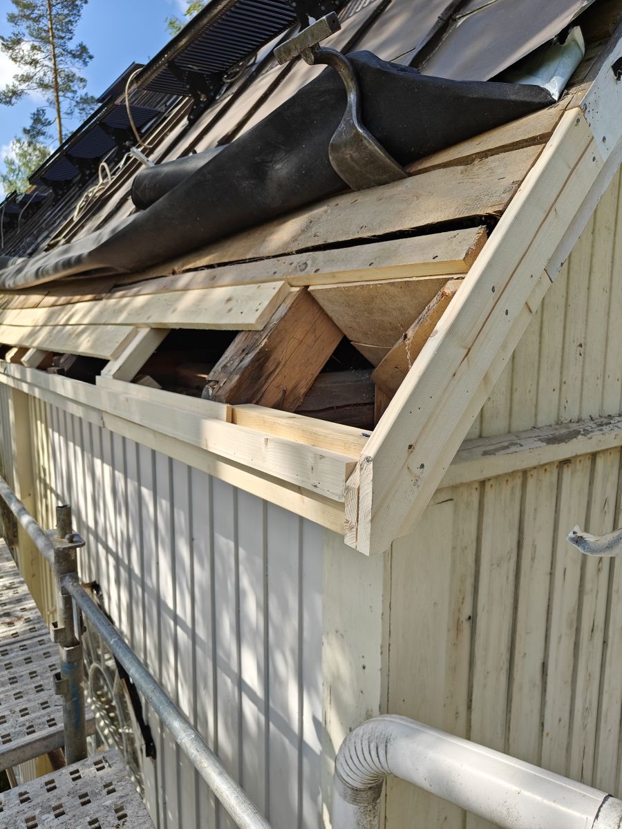 Kuvassa räystäästä ja seinältä korjattuja lahovaurioita jalkarännien alta, samalla osa kattotuolien alapäistä uusittiin ja tuettiin, sekä räystäslaudoille tehtiin uudet juoksut. Tämän päälle maalaukset, ruoteet, kermi ja pelti.