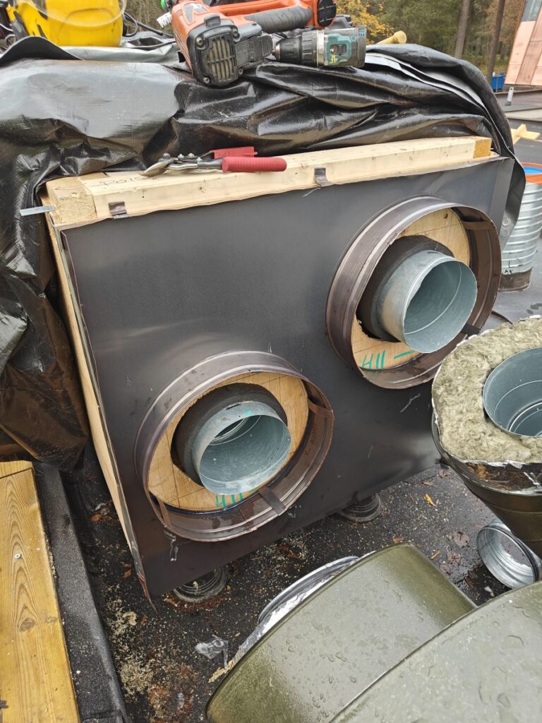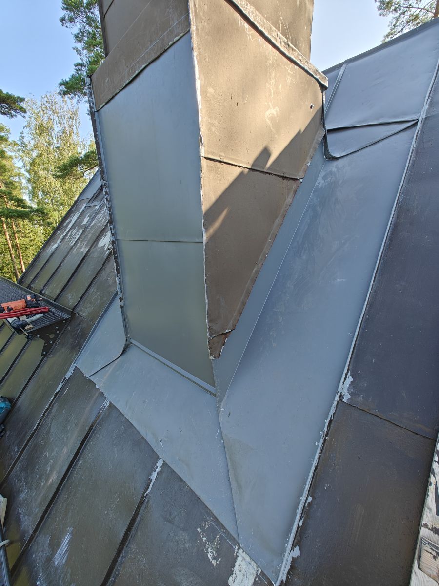 Kuvassa uusi konesaumatun katon piipun juuriosa, joka on saumattu vanhaan kattoon ja yhdistyy vanhoihin piipun kuoriin. Materiaalina SSAB GreenCoat TSP Legacy 0.6mm, joka sisältää saman määrän sinkkiä neliölle kuin perinteinen kirkas kattopelti, mutta voidaan pohjamaalinsa ansiosta maalata heti hapottamatta pintaa erikseen. Kohteen katto myös hiottiin, pestiin ja maalattiin korjausten jälkeen.