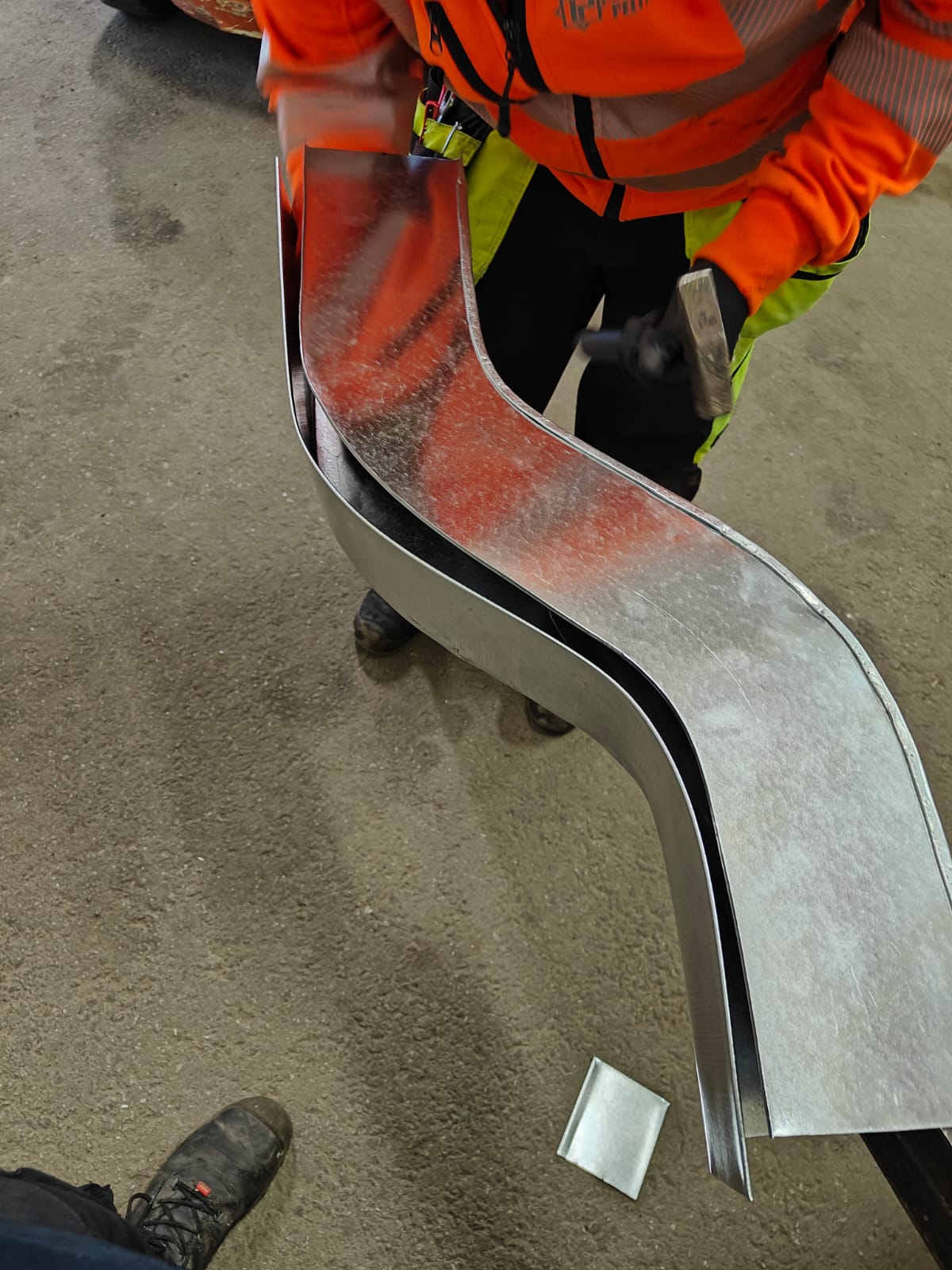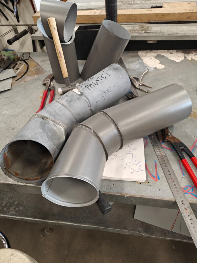 Kuvassa s-mutka, jota saumataan yhteen neljästä eri palasesta. Materiaalina 0.6mm sinkitty peltisepänlaadun teräspelti.