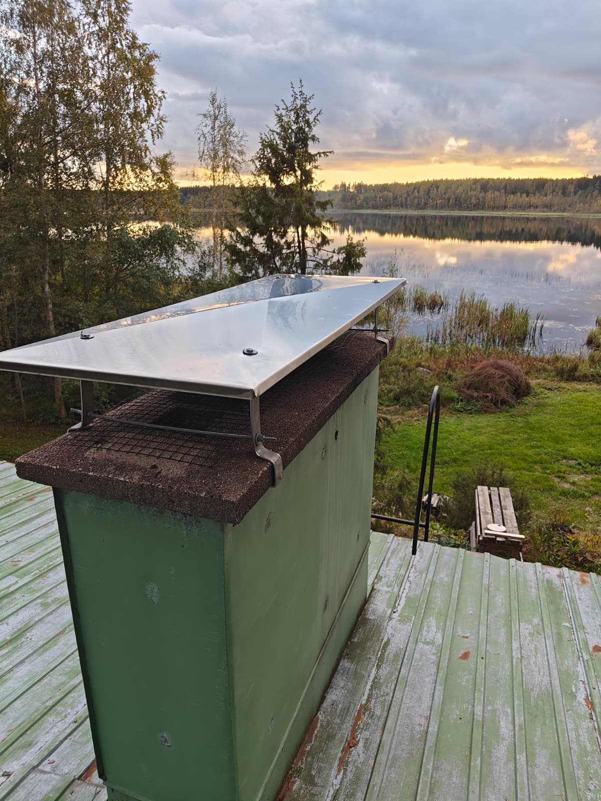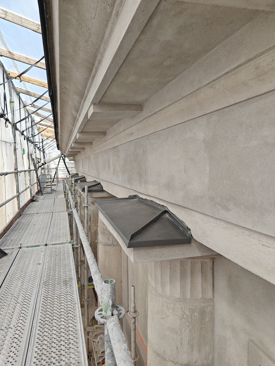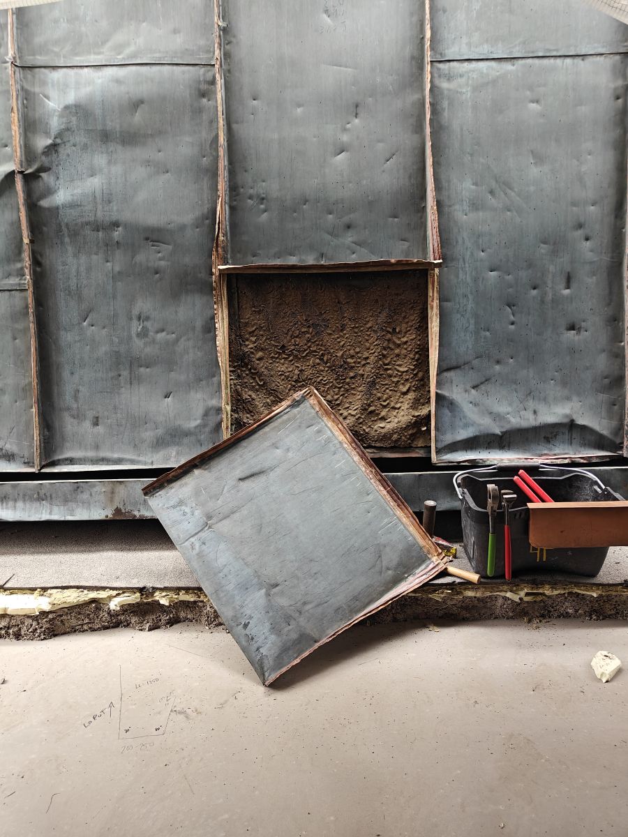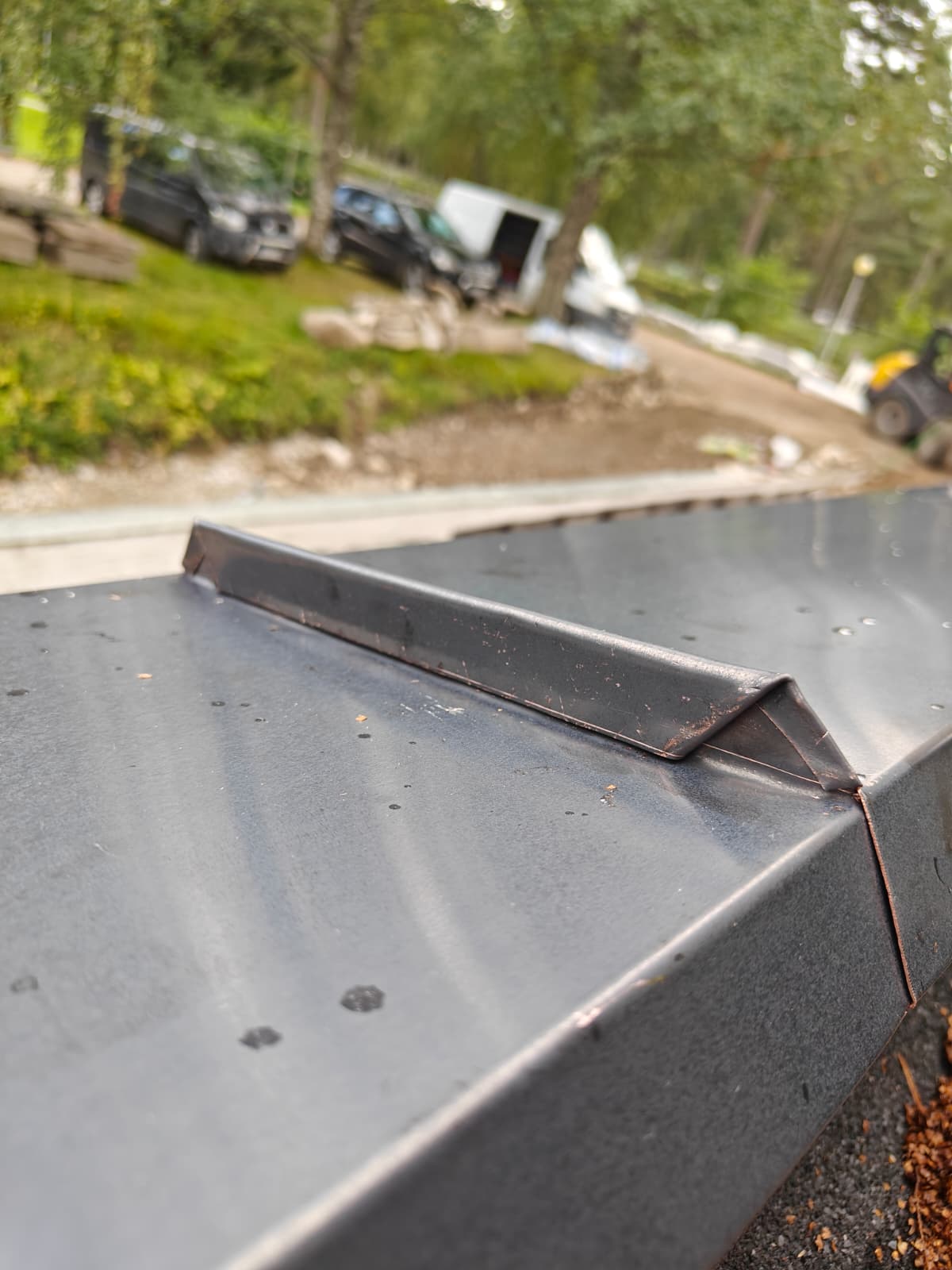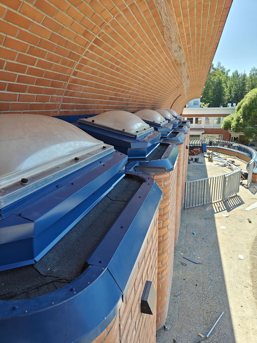 Kuvassa uusi konesaumatun katon piipun juuriosa, joka on saumattu vanhaan kattoon ja yhdistyy vanhoihin piipun kuoriin. Materiaalina SSAB GreenCoat TSP Legacy 0.6mm, joka sisältää saman määrän sinkkiä neliölle kuin perinteinen kirkas kattopelti, mutta voidaan pohjamaalinsa ansiosta maalata heti hapottamatta pintaa erikseen. Kohteen katto myös hiottiin, pestiin ja maalattiin korjausten jälkeen.